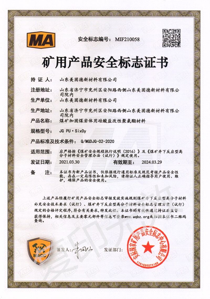 山东美固德新材料有限公司为高新技术企业,坐落于中国工业强区、大禹定九州之地的山东省级工业园-兖州化学助剂产业园。公司2011年始建于青岛,2016年为济宁市重点招商项目落户于兖州,公司专注于为煤矿安全生产提供可靠的矿用化学材料和解决方案。公司2018年同青岛科技大学(原青岛化工学院)高分子科学与工程学院签订技术合作协议,分别在兖州和青岛设立了研发实验室和应用发展实验室,并建立了研究生实践基地。2021年3月12日与中国聚氨酯协会特聘专家团队签订了战略合作协议,致力于聚氨酯高端领域的配方设计、生产及应用,为生产优质的产品提供强有力的技术保障。