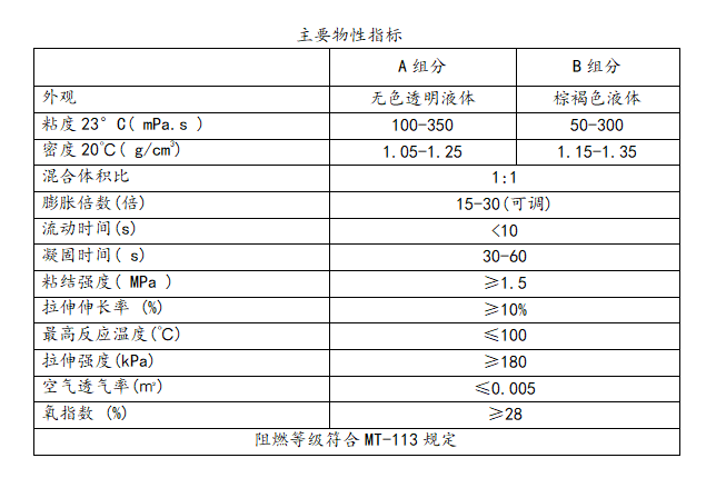 斯喷瑞332喷涂材料是一种双组分、多用途结合的聚氨酯材料。施工时将双组分通过喷枪混合,喷至井下密封目标物表面,双组分迅速反应、膨胀,并由粘性物转变成高阻燃型泡沫固结体。利用该产品较高的粘结强度、良好的韧性,可以堵漏风、封堵瓦斯,并起到辅助支护作用。产品优异的阻燃性和抗静电性能满足煤矿安全要求。